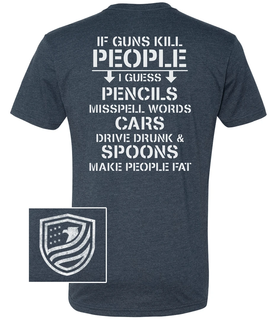 If guns kill people, then we assume cars also drive drunk, pencils misspell words and spoons make people fat – all just by their existence. We agree, pretty absurd right? It’s our own human choices that make the difference. Show your support for the 2nd Amendment with a bit of humor regarding use of common sense.